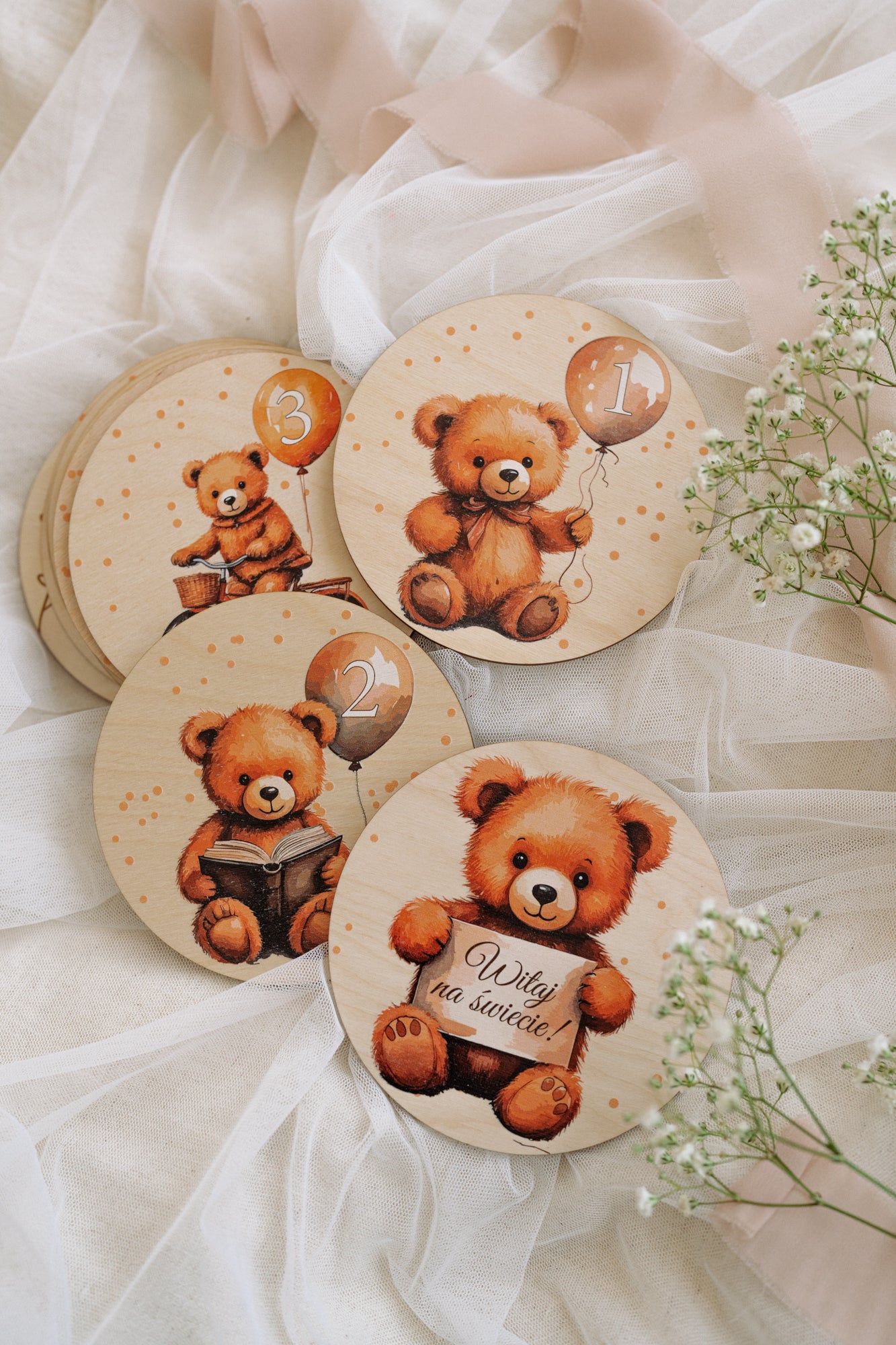 - Jedno z kółek ma napis "Witaj na świecie", a pozostałe są oznaczone numerami od 1 do 12, idealne do dokumentowania rozwoju dziecka w każdym miesiącu pierwszego roku życia.