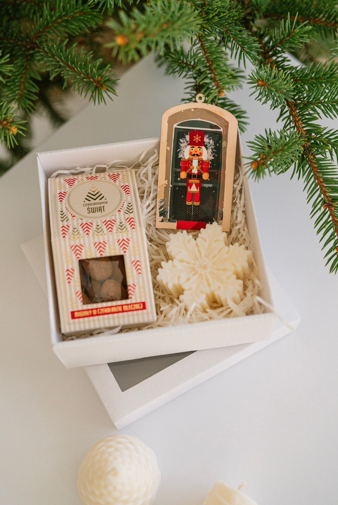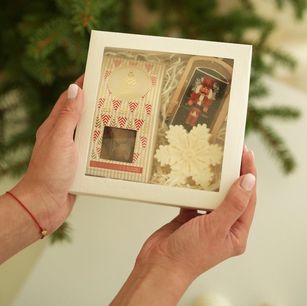 Box "Świąteczny Drobiazg" to idealna kompozycja, która łączy w sobie świąteczny urok oraz minimalizm. Mała świeczka w kształcie śnieżynki nie tylko wprowadza przytulny klimat, ale także stanowi piękną dekorację. Migdały w czekoladzie to smakowita uczta, która umili świąteczne chwile. Zawieszka na choinkę dodaje osobistego akcentu, sprawiając, że każdy element zestawu ma swoje znaczenie.