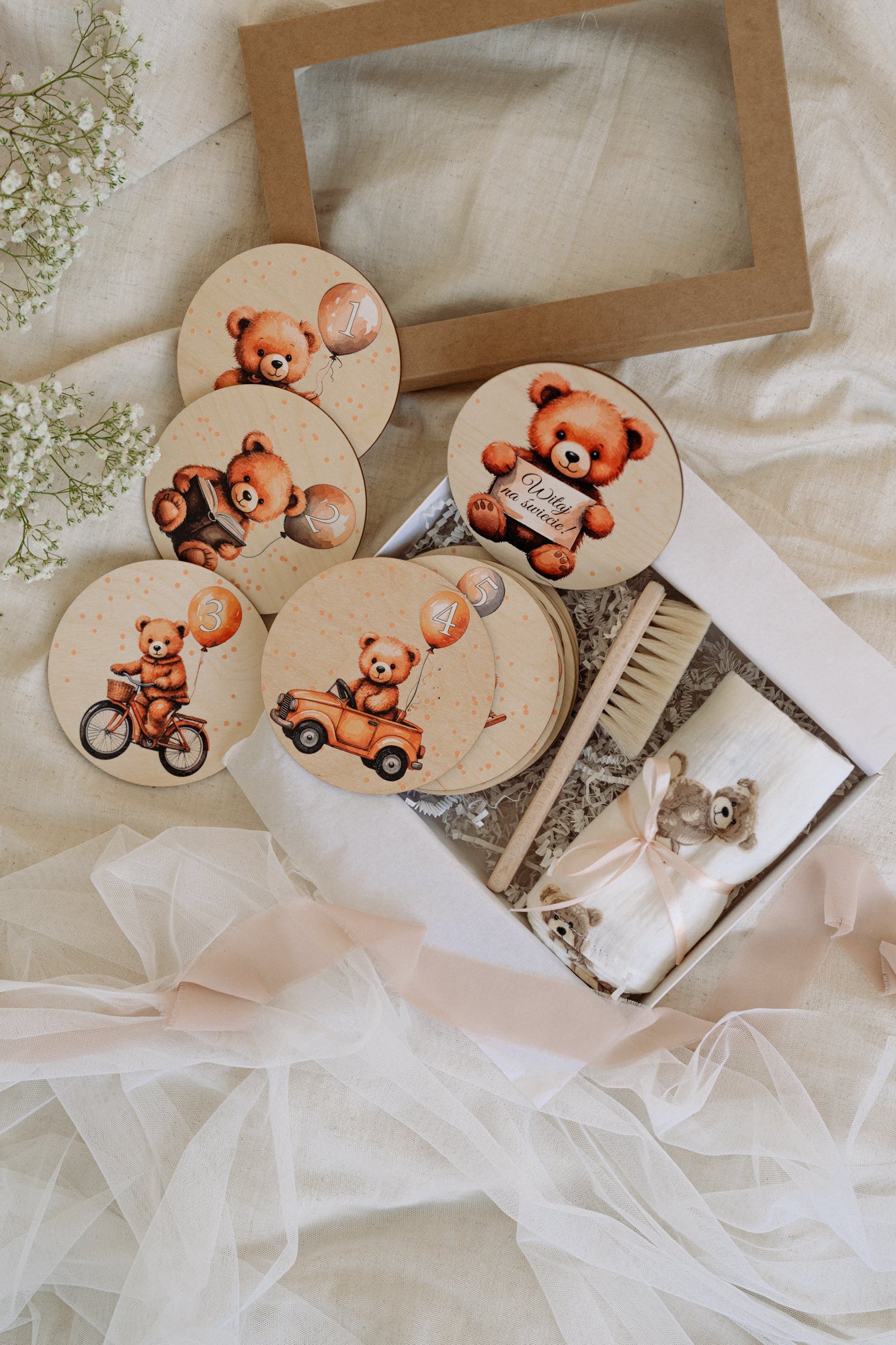 - Jedno z kółek ma napis "Witaj na świecie", a pozostałe są oznaczone numerami od 1 do 12, idealne do dokumentowania rozwoju dziecka w każdym miesiącu pierwszego roku życia. 🐻