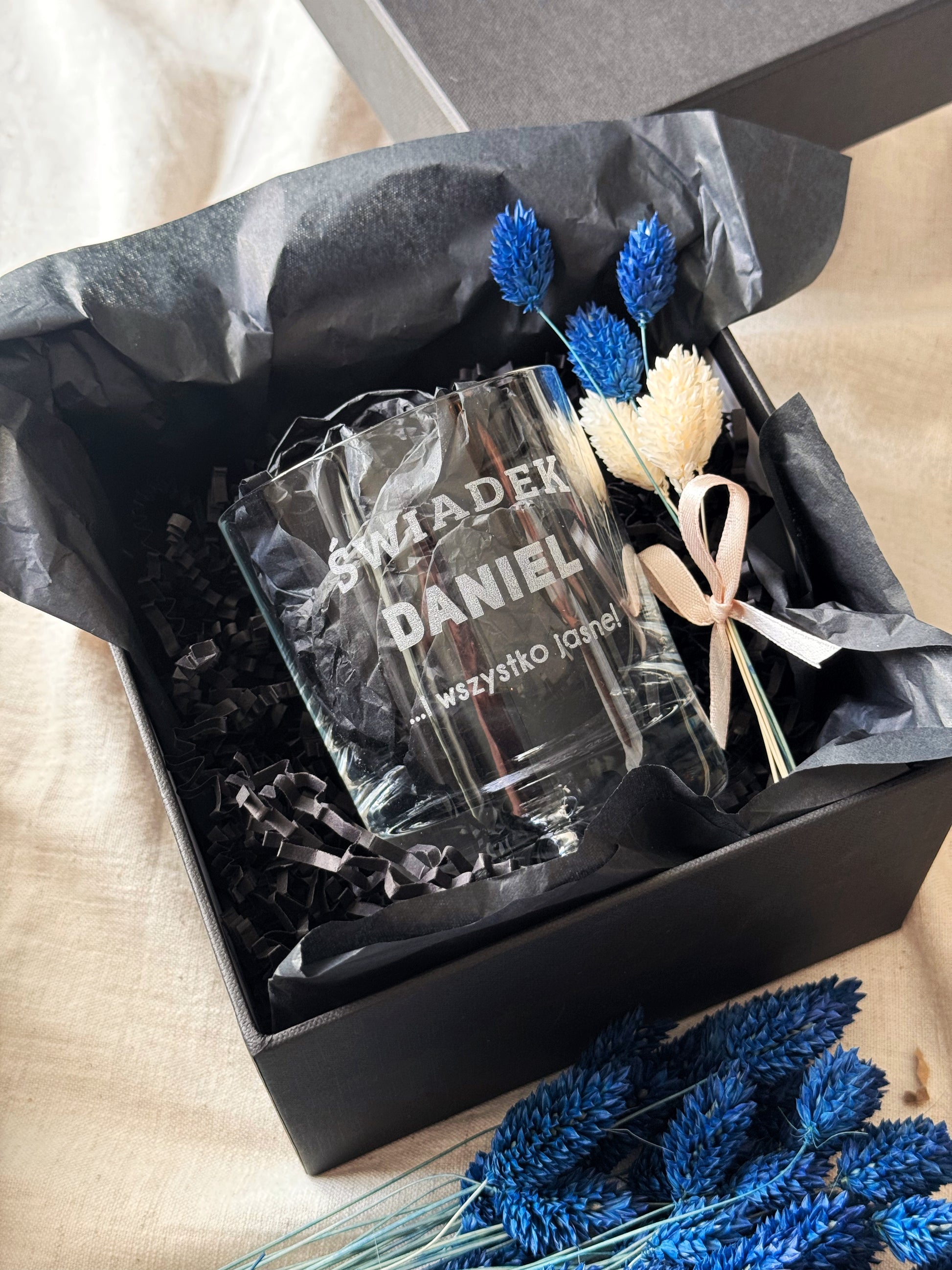 Nasz Box Prezentowy z Personalizowaną Szklanką to wyjątkowy zestaw, który łączy elegancję z osobistym akcentem. To doskonały sposób na podarowanie czegoś wyjątkowego dla taty, partnera czy świadka. 💙
