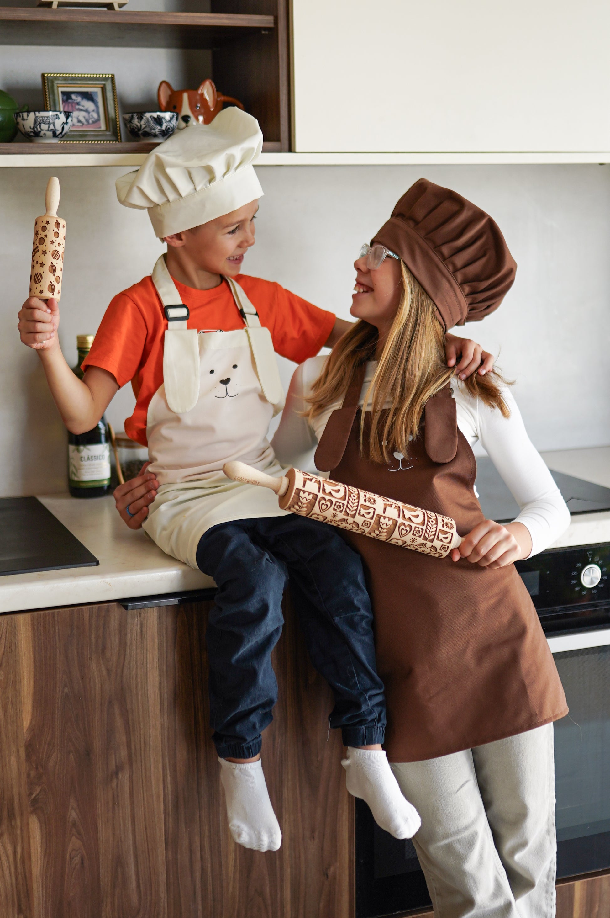 - Zestaw fartuszka i czapki kucharskiej, regulowane, pasujące na dzieci w wieku od 3 do 11 lat